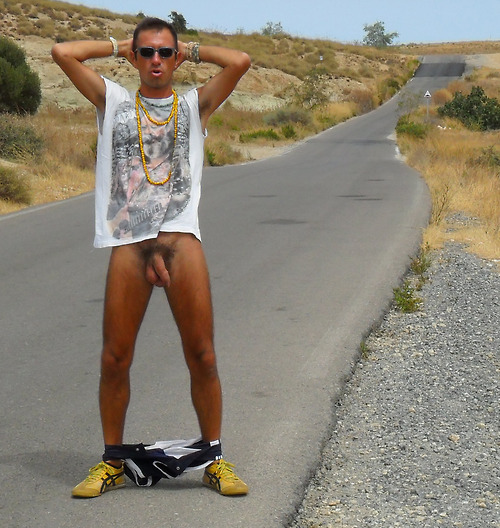Before I could raise my hand, the car stopped 10 feet from me. Now I saw a gorgeous young man about 23 with short blonde hair and a body of a Greek god behind the wheel. Alone. And he was wearing nothing but a pair of black, loose and rather revealing shorts and black sunglasses. I felt a wave of heat going through me, as I walked towards the car. The man was smiling and I stepped next to the car. "So, are you hitchhiking here all alone in the middle of nowhere?" he asked taking off his sunglasses. He was incredibly cute! "Yes. I'm Steve. Where are you heading?" I asked confidently.